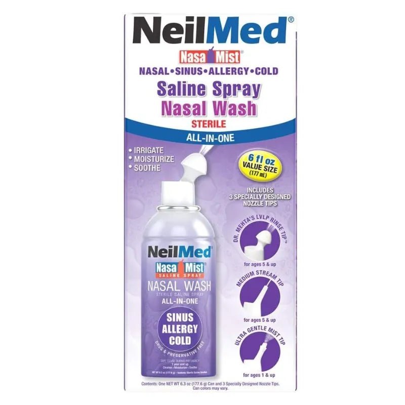 NasaMist Saline Spray All-In-One is a nasal moisturizer and saline rinse all in one can. Soothe, moisturize and cleanse using specially designed Large Volume Rinse Tip.