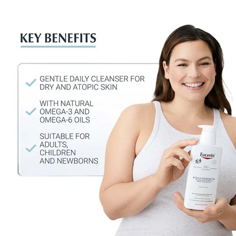 Eucerin AtoControl Bath & Shower Oil 400ml is the perfect solution for those with dry and irritated skin. This cleansing oil is specially formulated to minimise the risk of skin irritation and allergies, making it a great choice for daily showering and bathing. Unlike other products, this oil does not contain any preservatives, fragrance or colourants, making it gentle on your skin.
