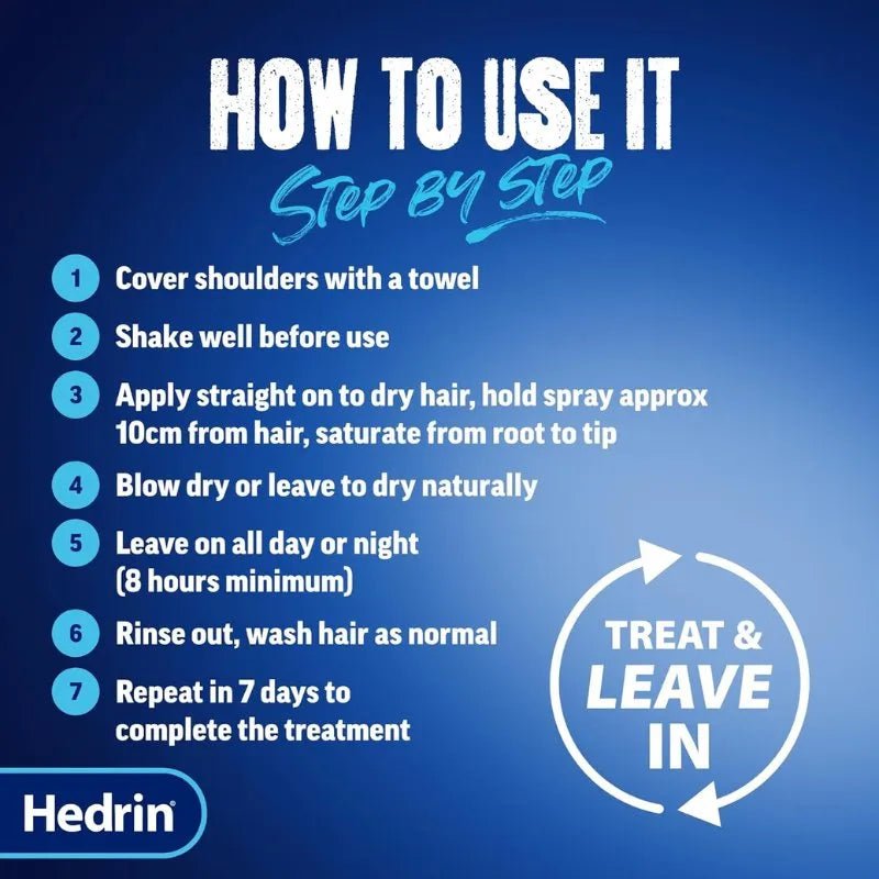 The water-based treatment contains a fast-acting formula that will kill head lice & eggs with no fuss. Hedrin Treat & Go spray is light and non-sticky. It distributes easily across the hair. And children can play, go to school or sleep while it gets to work.