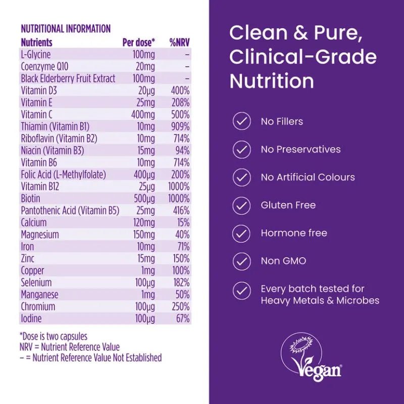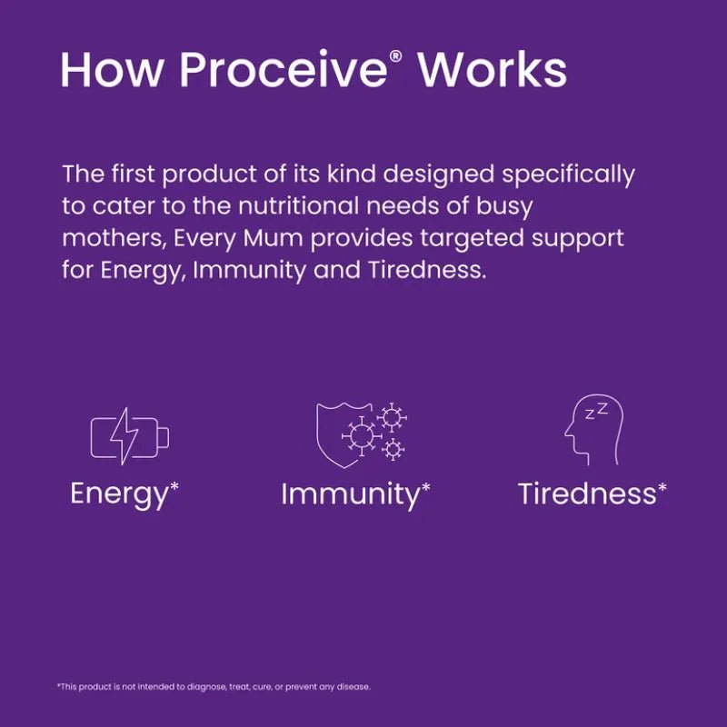 Proceive Daily Support Every Mum 60 Capsules provides 23 essential vitamins and minerals in their most bioavailable forms, targeting Energy, Immunity, and Tiredness for improved vitality and energy in your daily life.