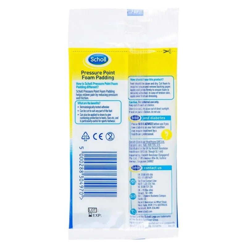 Scholl Pressure Point Foam Padding is the perfect solution for anyone looking to relieve pressure and pain on their feet. Whether you're dealing with calluses, corns, verruca's, or just uncomfortable shoes, these foam cushions will make every step a comfortable one. The dermatologically tested adhesive pad securely adheres to your skin and can be cut to fit any part of your foot, including the heel, ball, top, toe, sole, or bridge. Plus, it's versatile enough to be applied to your shoes for protective cushioning where you need it, especially on sports footwear.