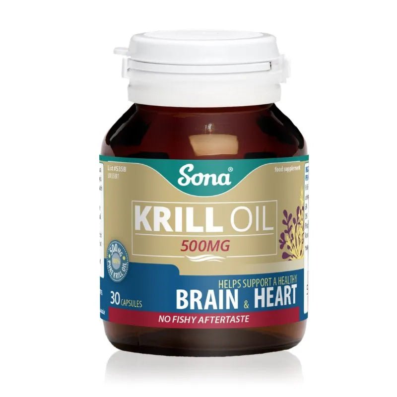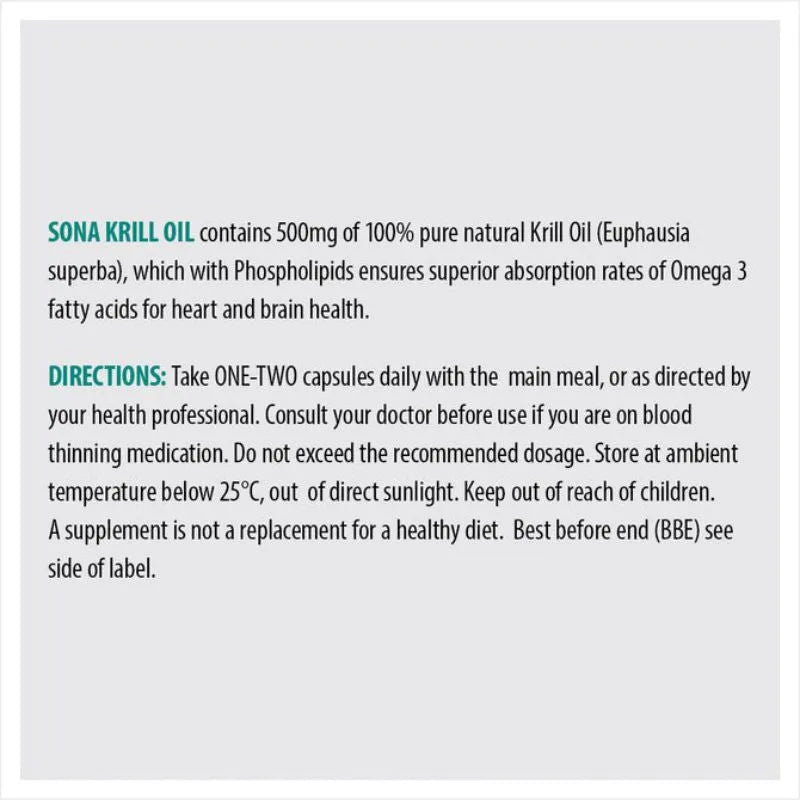 Sona Krill Oil Capsules contain 500mg of potent Omega 3 fatty acids per capsule that promote healthy vision, heart, and brain function. Experience the benefits without any fishy aftertaste, thanks to our carefully designed formula. Each pack contains 30 capsules, free from artificial colours, flavours, and preservatives.