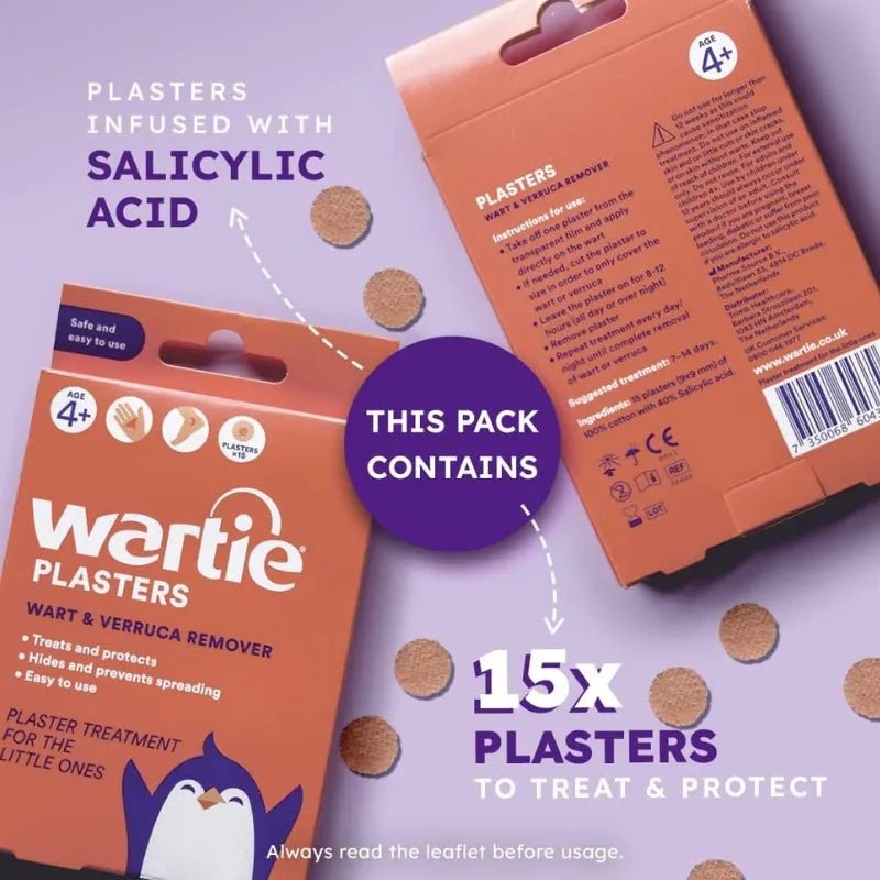 Wartie Plasters 15 Pack offers a clinically designed solution for treating warts and verruca's on hands and feet caused by human papillomaviruses. These plasters provide a protective barrier that not only helps to isolate the affected area but also prevents the spread of the virus to other parts of your body or to others.