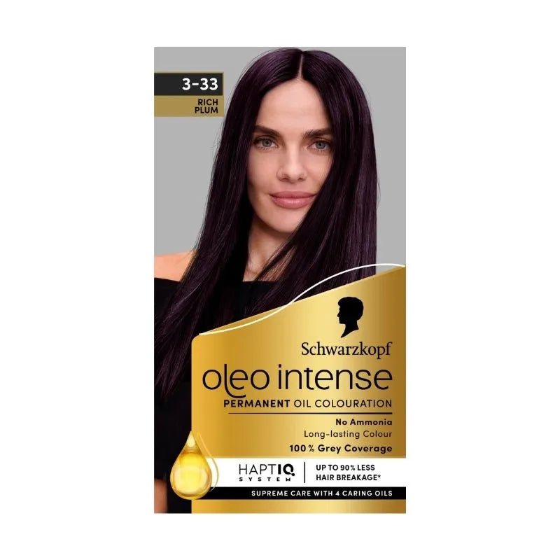 Schwarzkopf Oleo Intense Rich Plum 3-33 No Ammonia is a permanent hair colour ideal for medium blonde to light brown hair. Its nourishing oil formula delivers vibrant, long-lasting colour with up to 100% grey coverage. Enriched with fair trade argan oil in the conditioner, it strengthens hair while leaving it soft, smooth, and radiant.