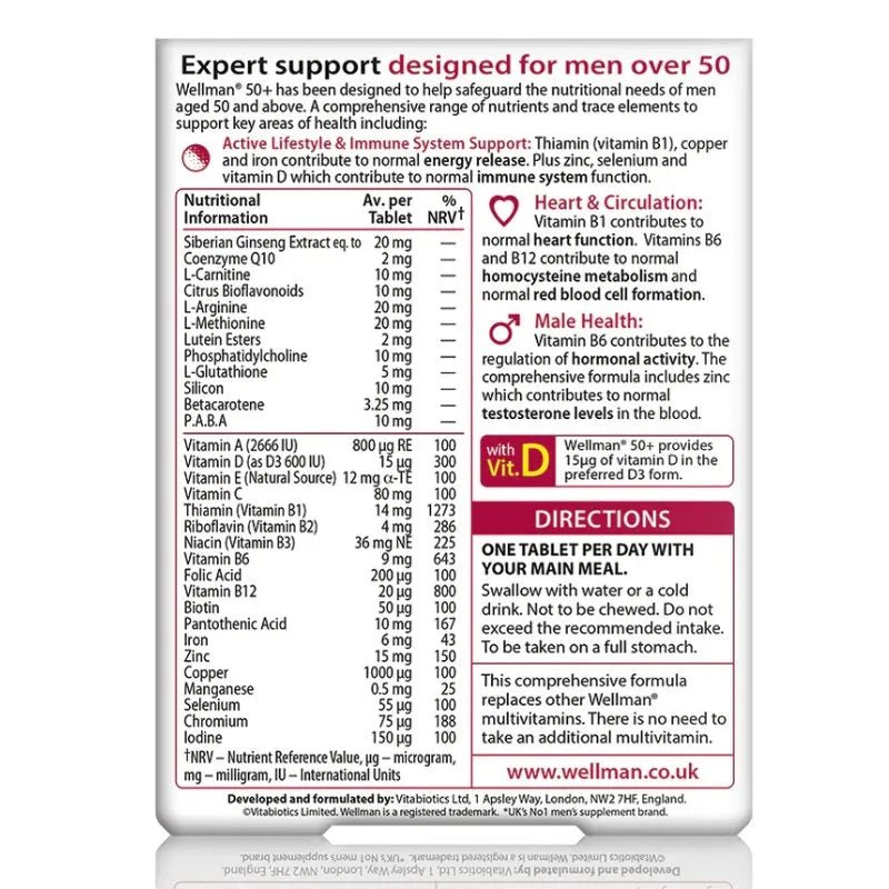Introducing Vitabiotics Wellman 50+ Tablets, a comprehensive nutritional formula specifically designed for men over 50. This specially developed supplement is tailored to support areas of health that are particularly relevant to men in middle age, including energy, heart health, hormone balance, immune function, and overall well-being.