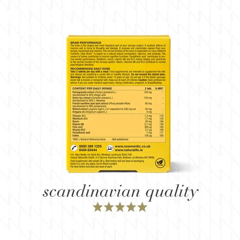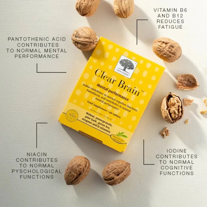 The brain is the largest and most important part of your nervous system. It contains billions of neurons, and is home to thoughts and feelings. It receives and coordinates signals from your senses, movement and memory. The normal function of the brain is dependent on many different nutrients. Clear Brain is based on a natural extract combination as well as vitamins and minerals. The content of iodine contributes to normal cognitive functions. Pantothenic acid contributes to normal mental performance. Riboflavin, niacin, vitamin B6 and B12 reduces fatigue and contribute to the normal function of the nervous system. Niacin, vitamin B6 and B12 contribute to normal psychological functions.