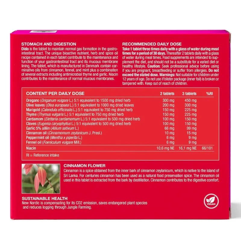 Recommended use is 3 tablets daily with water during meals for 30 days, followed by 2 tablets daily. Key ingredients include oregano, olive, marigold, cardamom, cloves extracts, and vitamin B3 (niacin).