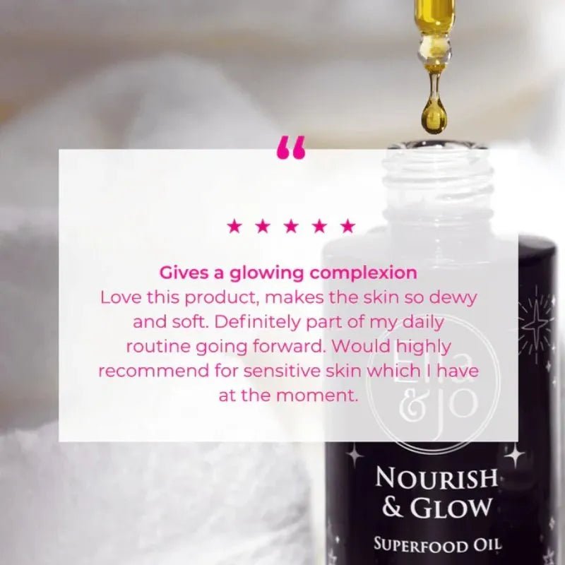 Comprised of a powerful combination of vital nutrients such as Essential Fatty Acids, Phospholipids, Retinol, and Vitamin E, our face oil is formulated to revitalize and fortify the skin's protective function. Enriched with high-quality oils like Rosehip, Jojoba, Blackcurrant, and Avocado, "Nourish and Glow" offers the ultimate solution for deeply nourished, supple, and moisturized skin.