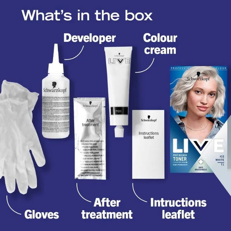 Schwarzkopf LIVE Ice White T1 is a semi-permanent toner designed for post-bleach care. This vegan, ammonia-free formula effectively neutralizes yellow tones, delivering a crisp blonde finish that lasts up to 16 washes. Enriched with a nourishing conditioner containing oils and vitamins, it leaves hair feeling soft and looking healthy with a radiant shine.