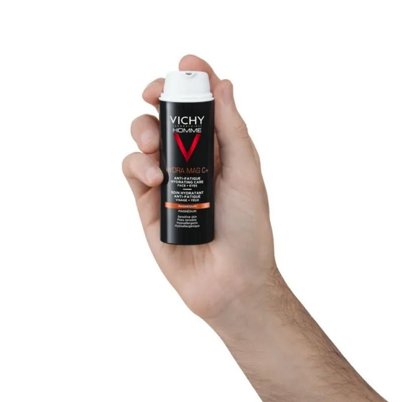 Use Vichy Homme Hydra Mag C + Anti-Fatigue 2-In-1 Moisturiser daily whilst after applying Mineral 89.