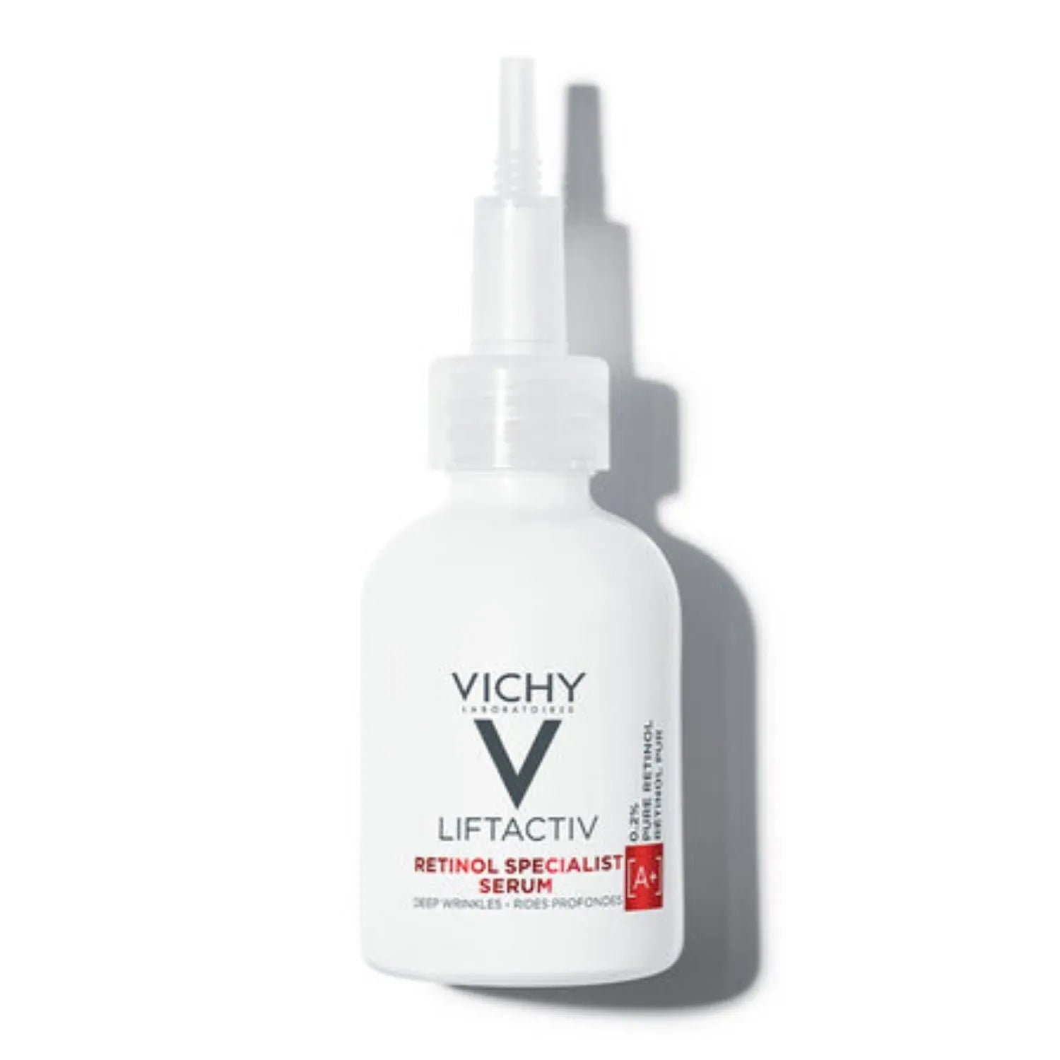 Vichy's Liftactiv Retinol Serum is formulated with 0.2% Pure Retinol and 1% Probiotic derived fractions to reduce wrinkles and lines, even skin tone, and brighten skin for a revitalized, radiant look. Clinically tested, it helps skin regain its elasticity, firmness, and suppleness, delivering outstanding anti-aging results with minimal discomfort.