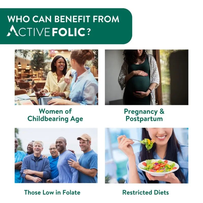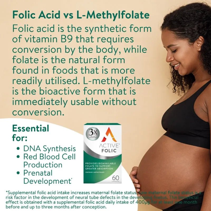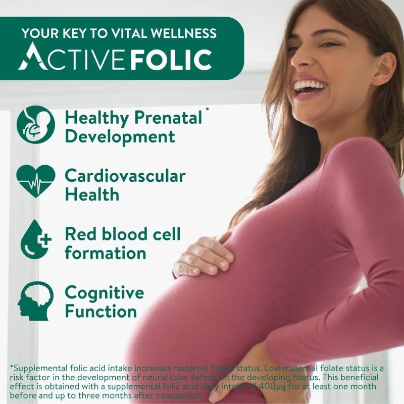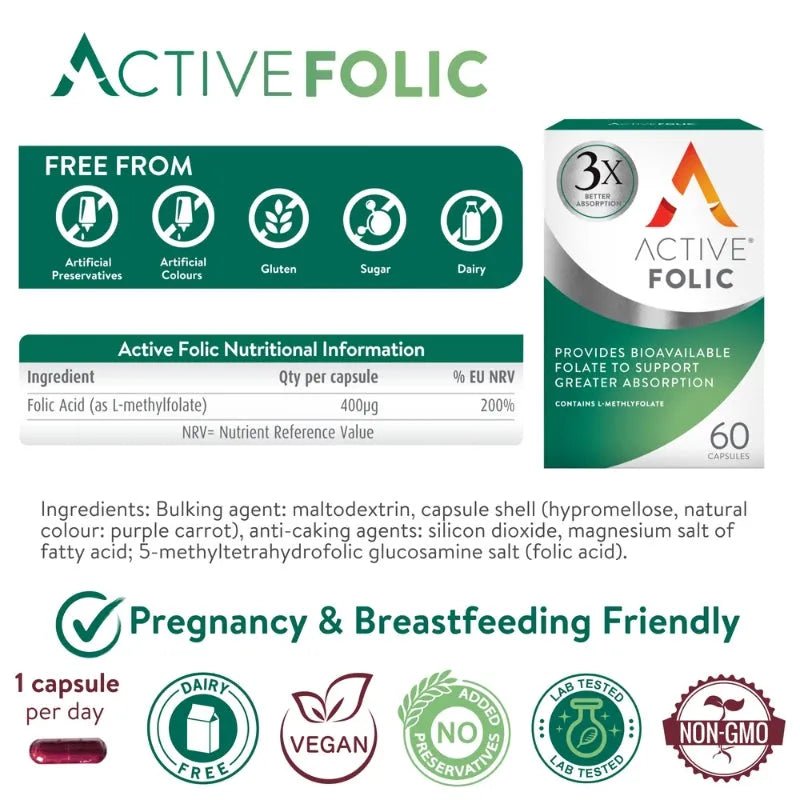 Active Folic Acid Tablets contain Folic Acid in its natural folate form for optimal absorption. Each tablet contains 400µg of Folic Acid, which is recommended for one month before conception and during the first 12 weeks of pregnancy to boost maternal folate levels.