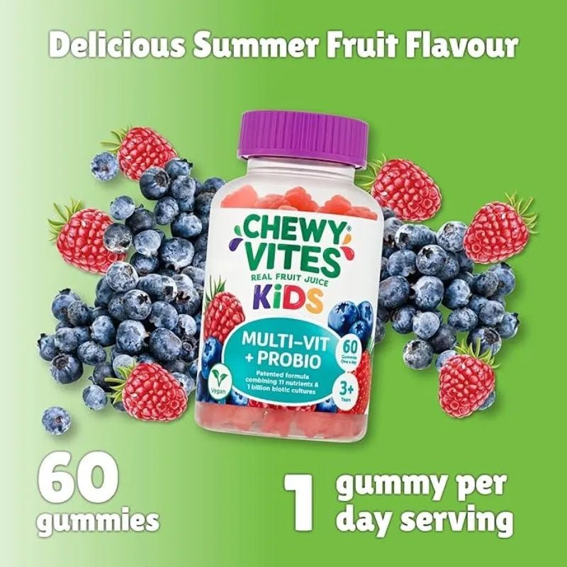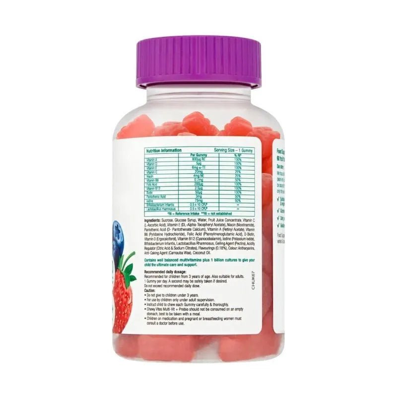 Chewy Vites Kids Multi Vitamin and Probiotic Capsules provide a tasty and convenient way to support your child's daily nutritional needs. Each capsule combines essential vitamins with probiotics to promote healthy growth, immune function, and digestive balance. With 60 chewable capsules per pack, it's easy to keep your child energized and thriving every day.