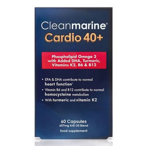 Cleanmarine Cardio 40+ is a nutritious blend of Omega 3 EPA and DHA, combined with organic Turmeric root extract, Vitamins K2, B6 and B12. This powerful blend of ingredients helps support normal heart function and helps maintain cholesterol levels already within the normal range.