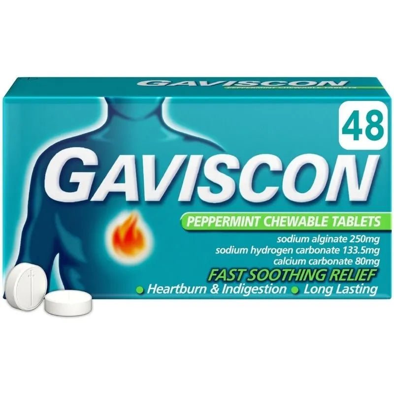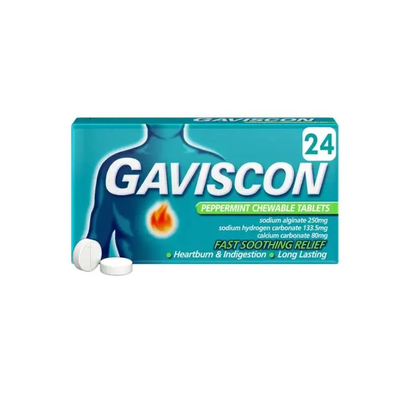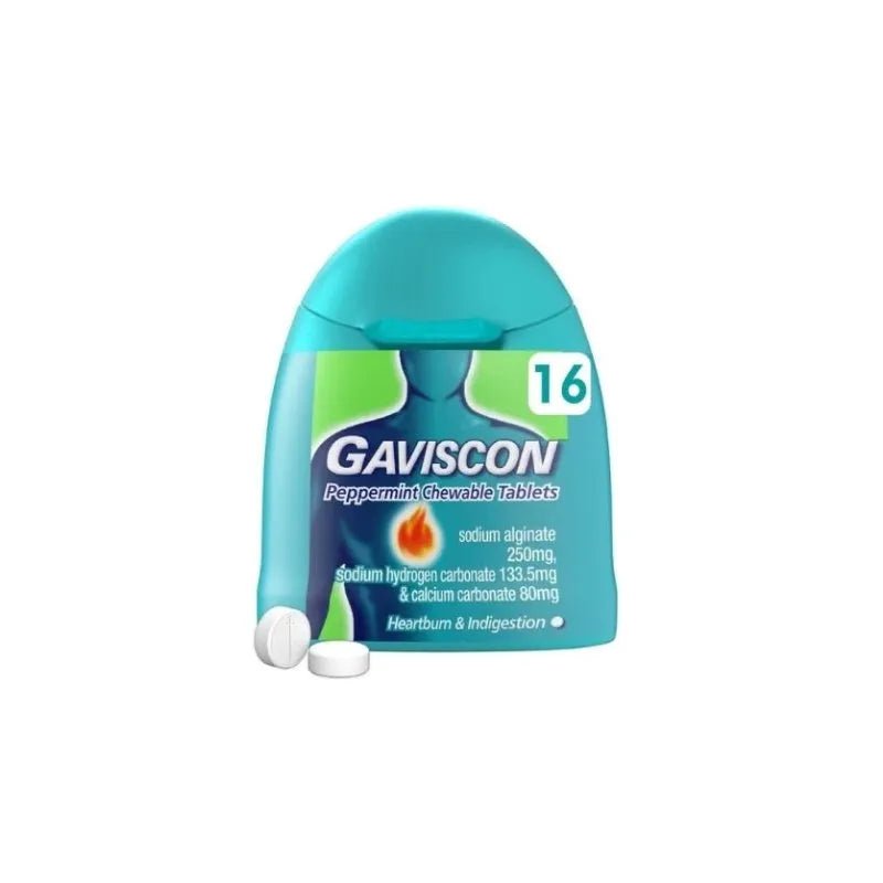 Gaviscon Peppermint Chewable Tablets contains Sodium Alginate, Sodium Bicarbonate and Calcium Carbonate for heartburn and indigestion.
