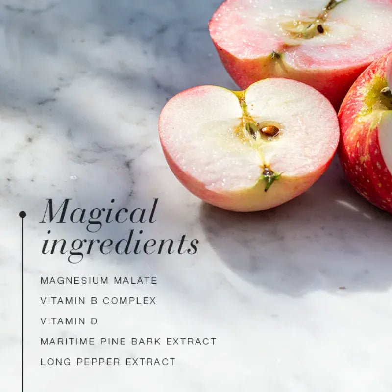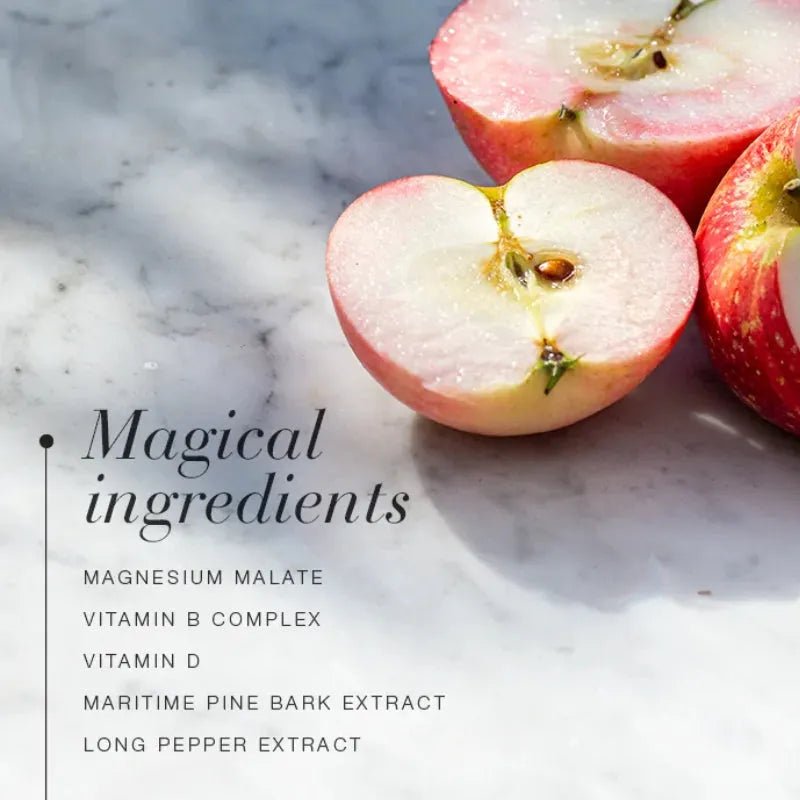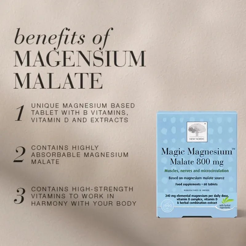 Discover the power of New Nordic Magic Magnesium Malate, a carefully crafted tablet featuring highly absorbable magnesium malate combined with B vitamins, vitamin D, and a herbal extract. Each dose provides 240 mg of elemental magnesium, supporting nerve function, muscle health, and bone maintenance. Magnesium also helps reduce tiredness and fatigue, while maritime pine bark enhances microcirculation by improving capillary permeability.
