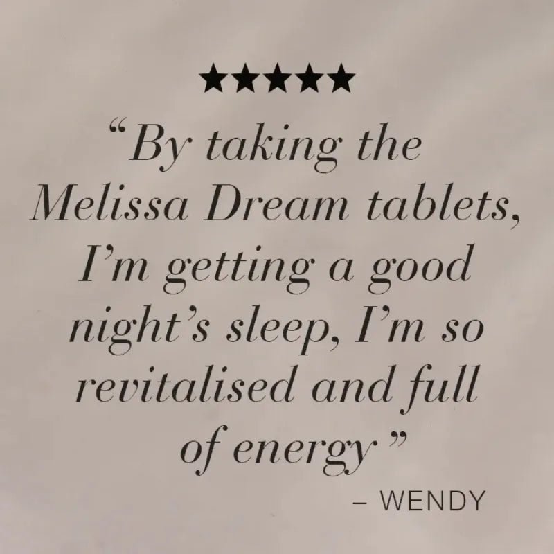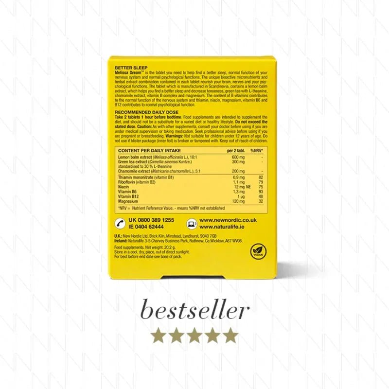 The Melissa Dream tablet is based on a combination extract made from lemon balm, chamomile and green tea plus vitamin-B and magnesium. Lemon balm contributes to a normal and calm sleep. Vitamin-B and magnesium helps the nervous system to function correctly. B-vitamins: thiamine, niacin, B6 and magnesium, which contributes to normal psychological functions such as, concentration, learning, memory and reasoning.