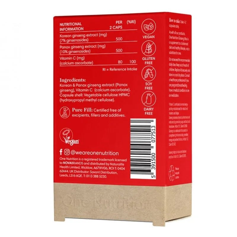Ginseng root extract blended with vitamin C for energy and performance. One Nutrition Ginseng Max is a high strength fusion of Korean and Chinese Panax Ginseng designed to increase physical performance and endurance, and combined with vitamin C to support energy and reduce tiredness & fatigue.