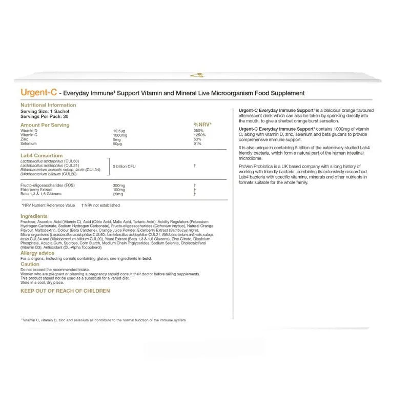 Urgent-C Everyday Immune Support is a delicious orange-flavoured effervescent drink that can also be taken by sprinkling directly into the mouth, to give a sherbet orange burst sensation. Designed for ongoing daily use, it contains 1000mg of vitamin C, along with vitamin D, zinc, selenium and beta-glucans to provide comprehensive immune support.