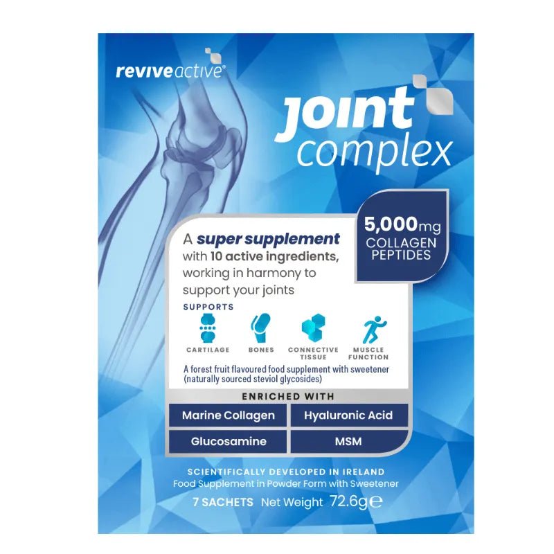 Joint Complex is a super supplement with 10 active ingredients formulated for adults (aged 18 and over). Made in a unique forest fruit flavour using a natural sweetener, steviol glycosides, with ingredients including Peptan Collagen Peptides (marine source), Hyaluronic Acid, Glucosamine, and MSM.