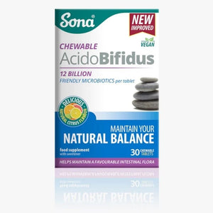 Sona AcidoBifidus is a chewable tablet. It has a high amount of good bacteria. Each tablet has 16 billion microorganisms that are friendly. These good bacteria live in the gut. They help make and keep a good balance of bacteria in the intestines, especially during and after taking antibiotics.
