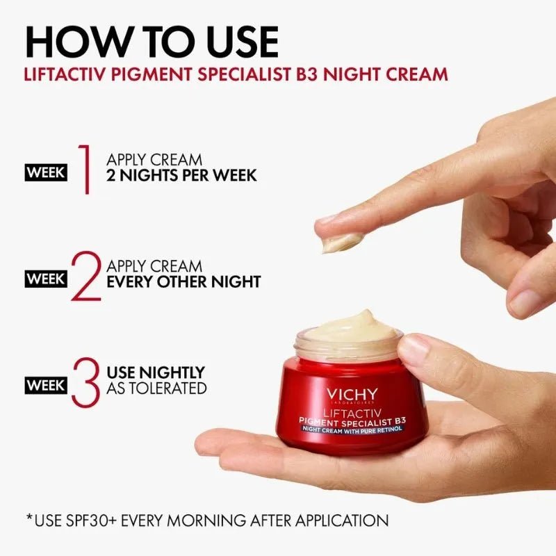Discover the all-new Vichy Liftactiv B3 Retinol Night Cream for a flawless skin tone and radiant complexion. Combat daily UV-induced pigmentation with our potent combination of Niacinamide (Vitamin B3) and 0.15% pure Retinol. This night cream boosts skin cell renewal and promotes a more even skin tone.