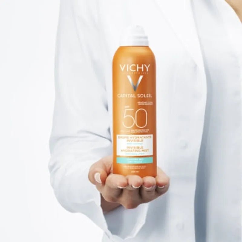 Experience the superior benefits of VICHY Capital Soleil Invisible Hydrating Mist SPF50, an undetectable sunscreen mist specially designed for sensitive skin. Not only will it provide essential protection for high sun exposure, but it will also revitalize and moisturize the skin. Enriched with VICHY Volcanic Water, this invigorating formula offers up to 24 hours of hydration for both the face and body, while effectively shielding against harmful UVA and UVB rays.