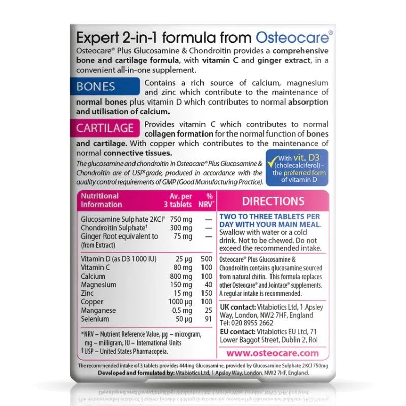 Swallow with water or a cold drink. Not to be chewed. Do not exceed the recommended intake. Osteocare Plus Glucosamine & Chondroitin contains glucosamine sourced from natural chitin. This formula replaces other Osteocare and Jointace supplements. A regular intake is recommended.