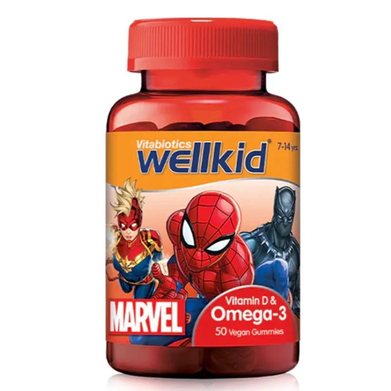 Introducing the Vitabiotics Wellkid Marvel Vitamin D & Omega-3 Soft Jellies 50 Pack, the ultimate nutritional support for your young hero on-the-go. These soft jellies are specially formulated with the highest quality DHA derived from natural vegan plant sources (algae).