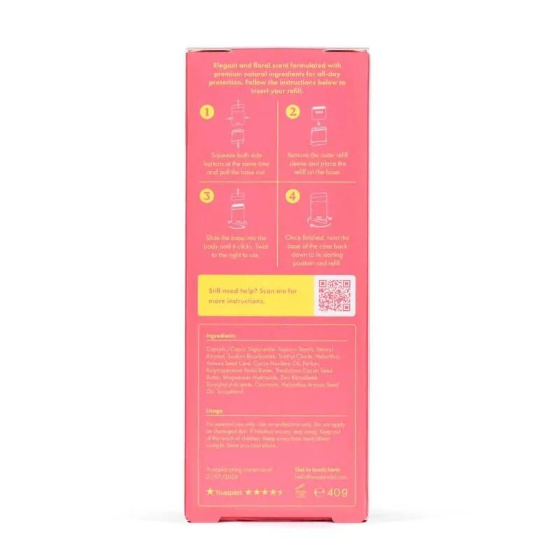Experience the intensely hydrating and revitalizing experience of cherry blossom with our luxurious Wild Deodorant Starter Pack. Made with premium ingredients, our deodorant will leave you feeling fresh and confident all day long. Add a touch of elegance to your daily routine with the exclusive pink case, perfect for on-the-go touch-ups.